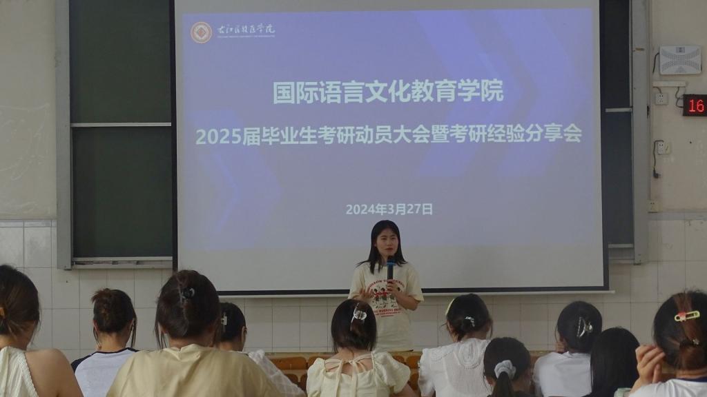 为激发学生考研的热情和动力,推动考研促学风建设,3月27日下午,国际语言文化教育学院在5号综合楼604教室举办了2025届毕业生考研动员大会暨考研经验分享会。会议邀请翻译专业教研室赵海莲老师、2023级翻译硕士研究生吴卓凝、杨靓作为主讲嘉宾。学院党委副书记张剑老师、辅导员蒙丽莎老师出席会议。我院2025届毕业生及其他年级有考研意向的同学参加会议。